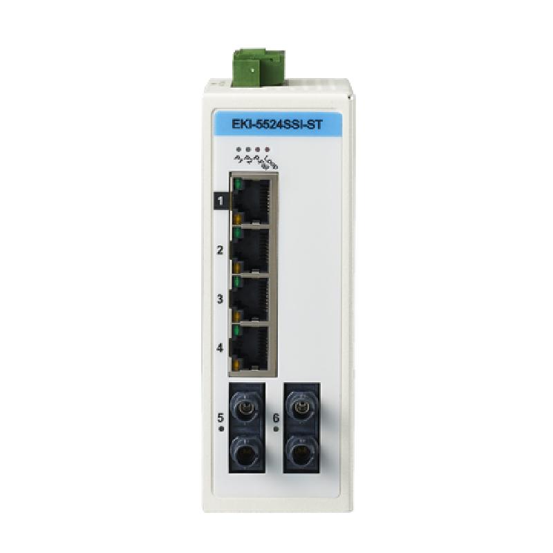 EKI-5524SS/SSI/SS-ST/SSI-ST及EKI-5524MM/MMI/MM-ST/MMI-ST是全球首款兼備工控與IT 雙重特質的非管理型工業以太網交換機。其支持Modbus/TCP 及SNMP 協議,可無縫連接SCADA 系統及IT 網管軟件,該款產品符合IEEE 802.1p QoS- VIP 端口- 確保關鍵數據的可靠傳送。此外,其擁有專用VIP 端口、自動環路故障檢測、智能節能、智能故障診斷及支持9,216 byte 巨型幀高效傳輸,支持8.4 ~ 52.8VDC 冗余電源輸入及-